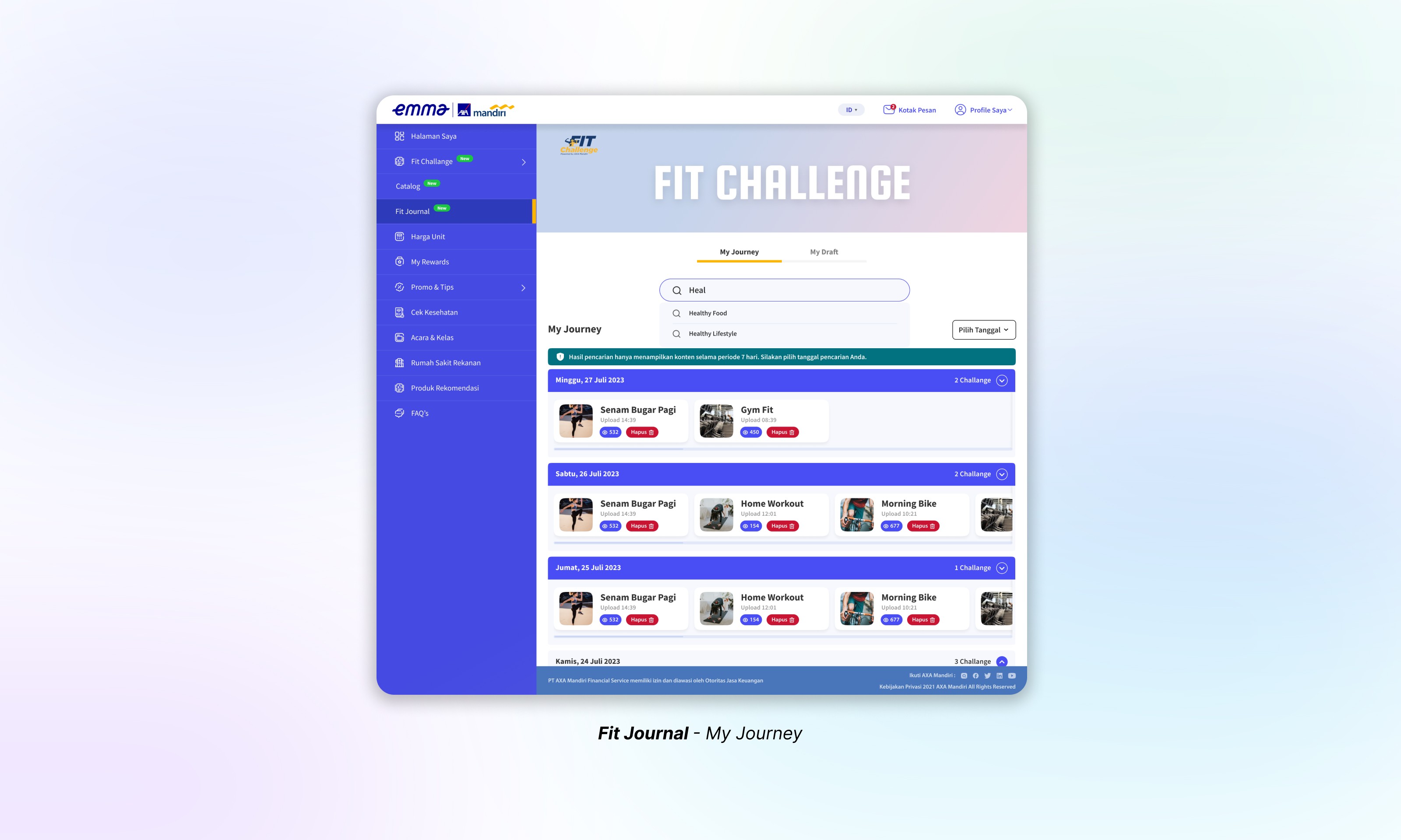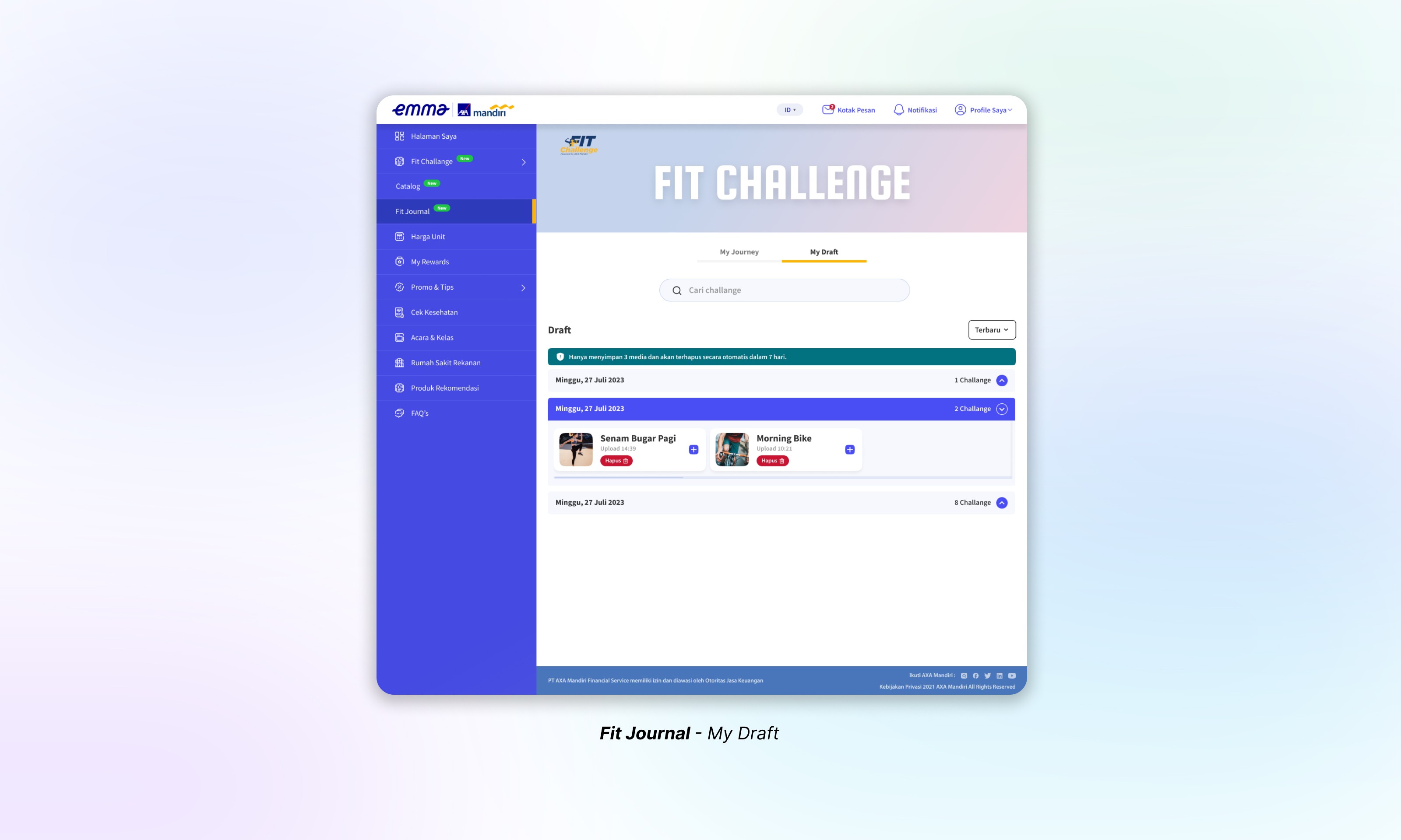The Emma AXA Mandiri platform provided the FIT Challenge feature, which included daily challenges, journal tracking, and the ability to publish content and share content on social media platforms. Developed over two months (June–August 2023), this feature was designed to support a healthy lifestyle by focusing on financial, mental, and physical well-being. The campaign officially began in August 2023.