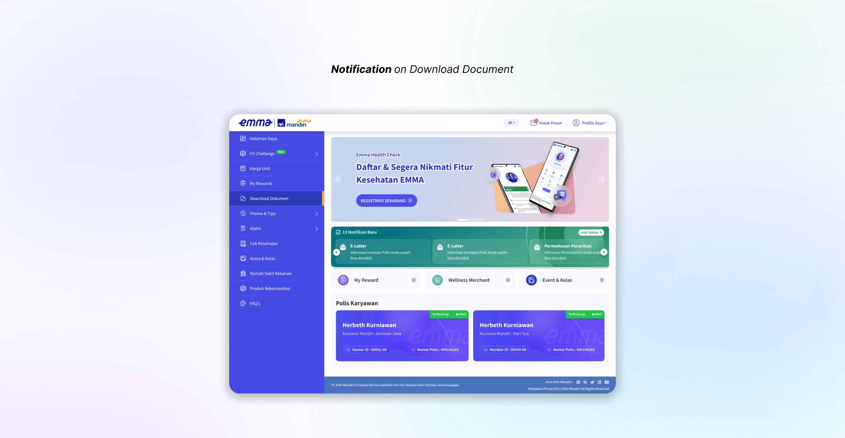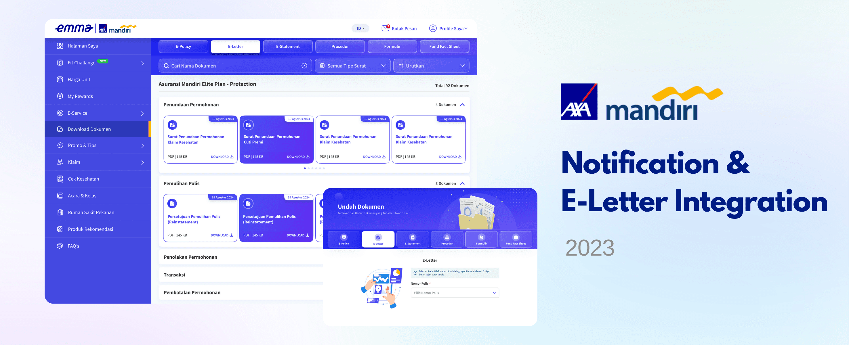 The E-Letter is not available on Emma yet, so we want to create a new notification and menu on the Emma AXA Mandiri platform.
