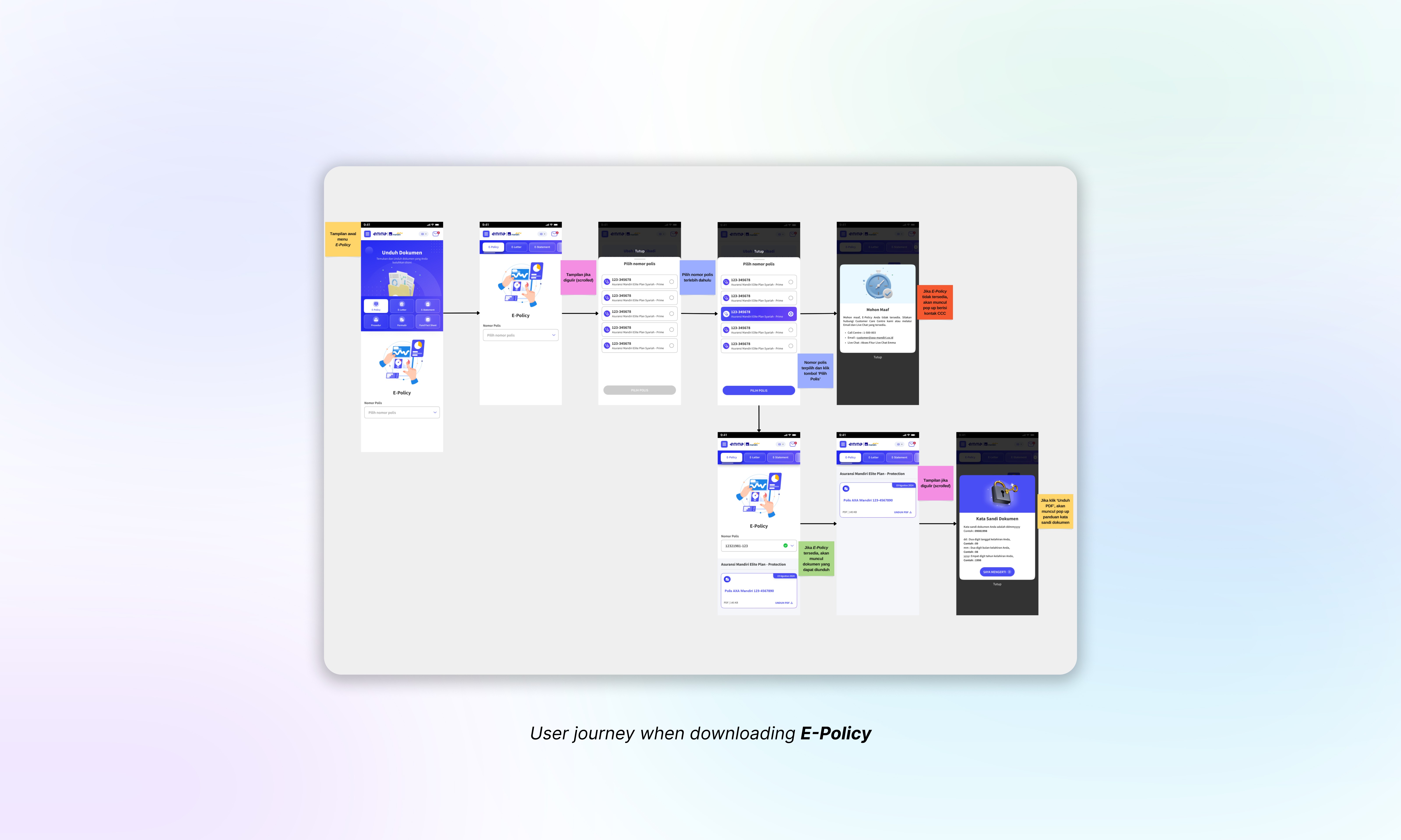 For E-Policy, E-Letter, and E-Statement, only users with customer or employee roles (with AXA Mandiri policies) are able to access them by entering their password, while guests without a policy are still able to download Procedure, Form, and Fund Fact Sheet documents.