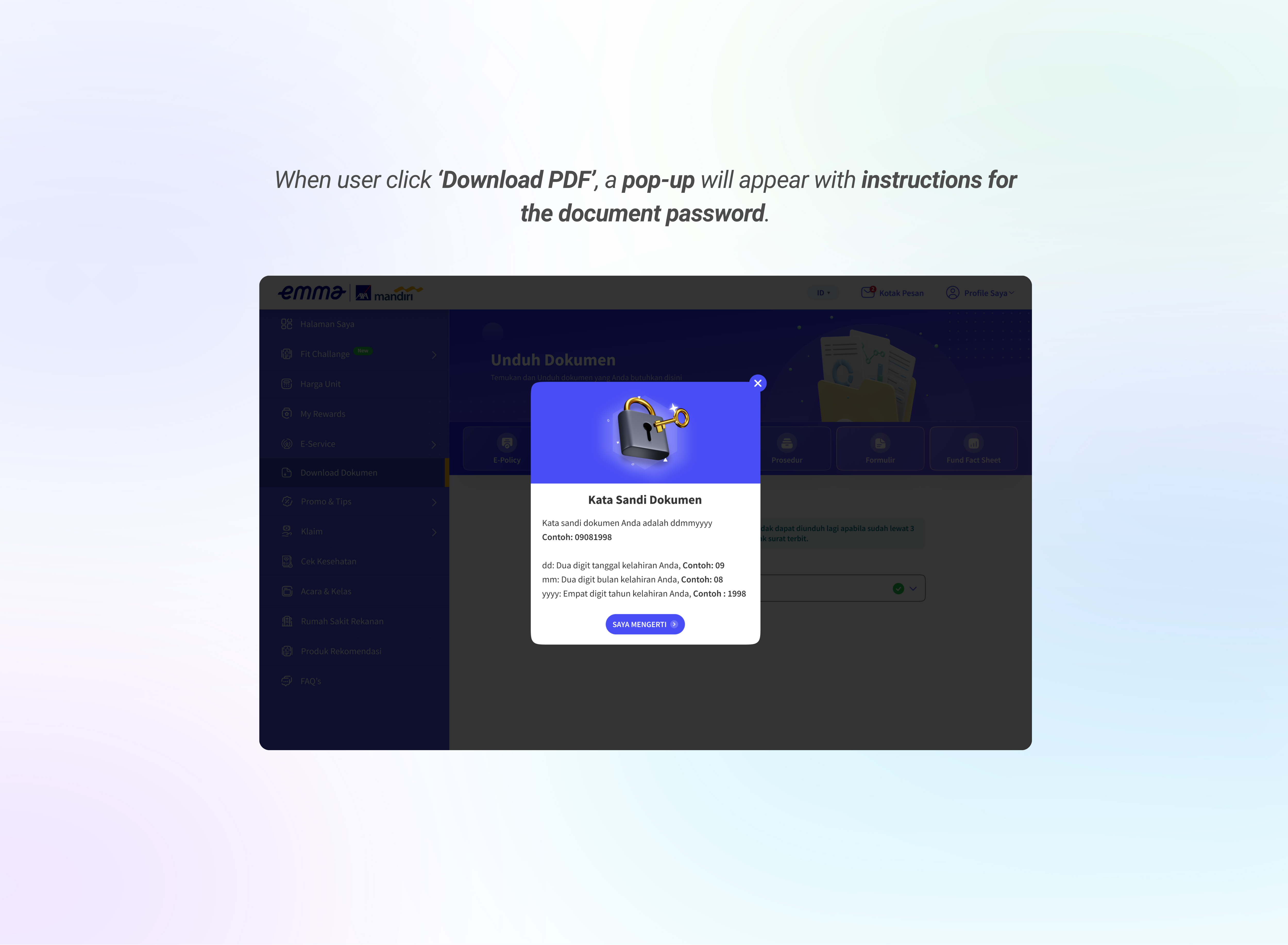 Users are able to download their E-Policy by clicking the download button. A password guidance pop-up will be displayed to guide them in entering the correct password combination.