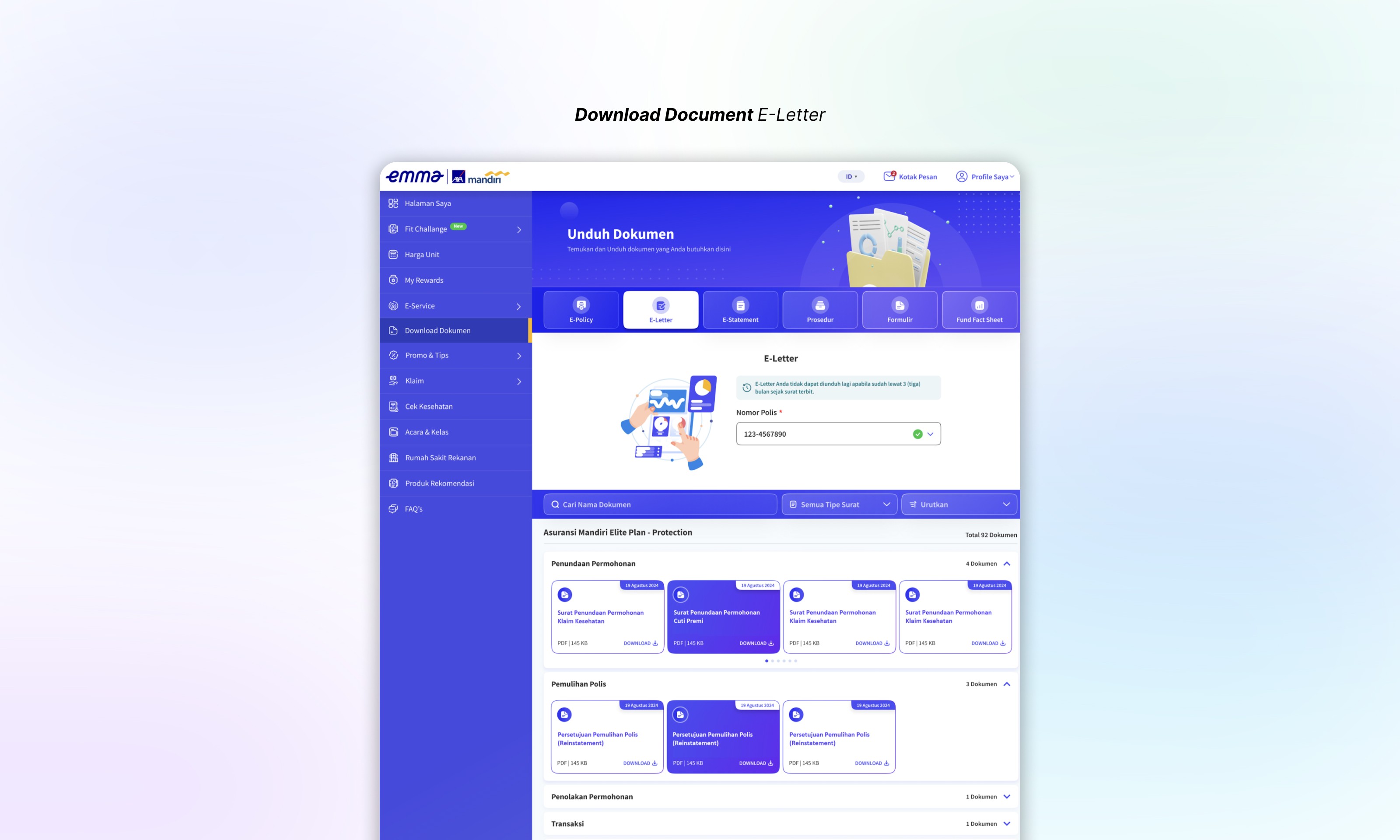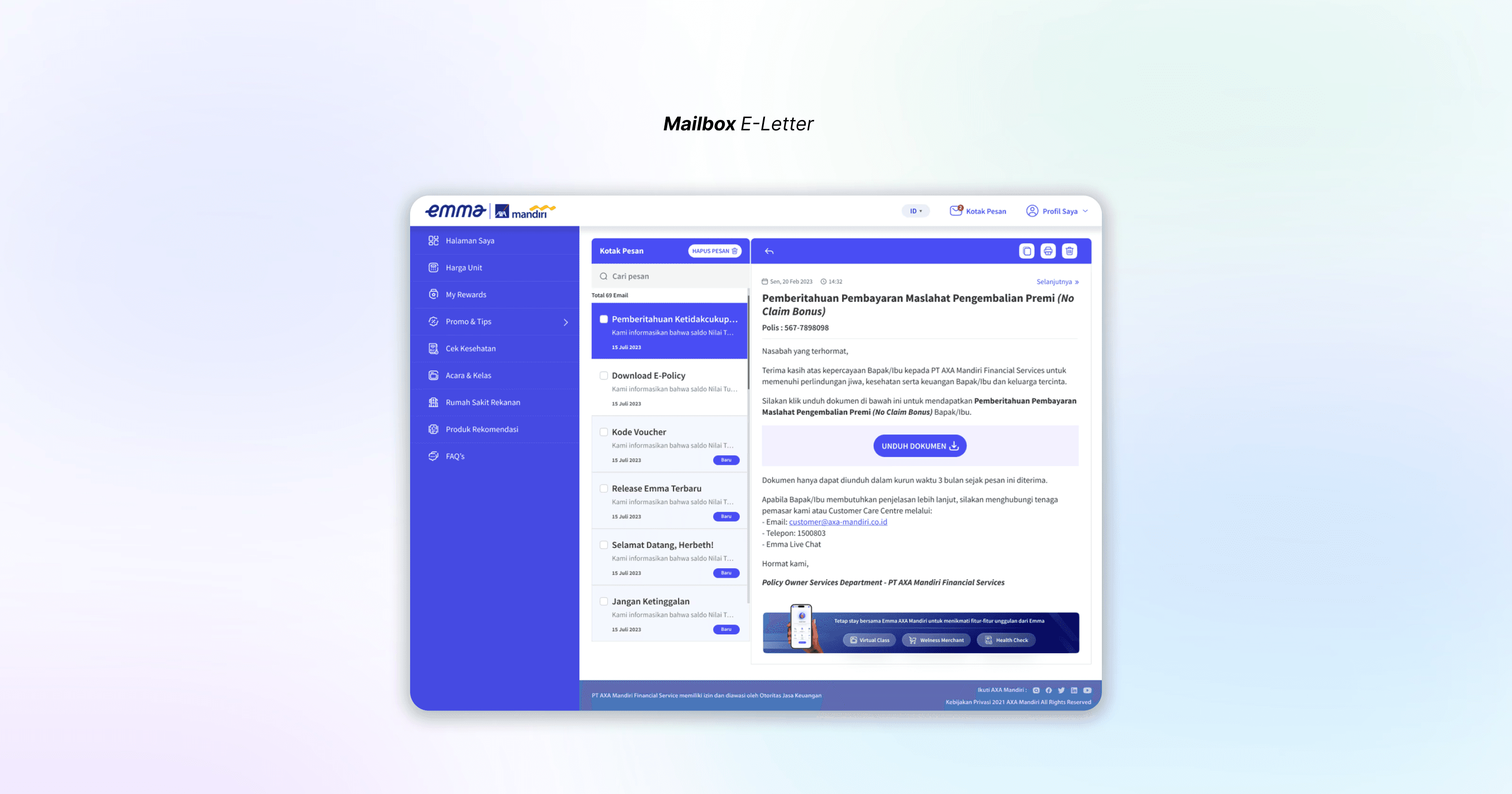 Customers and employees are able to view notifications of their new letters on Emma AXA Mandiri and read the messages in the Emma Mailbox. Users can download the letters as PDF documents saved on their device (smartphone, laptop, PC, or tablet), or later access them through the ‘Download Document’ menu if not downloaded directly.