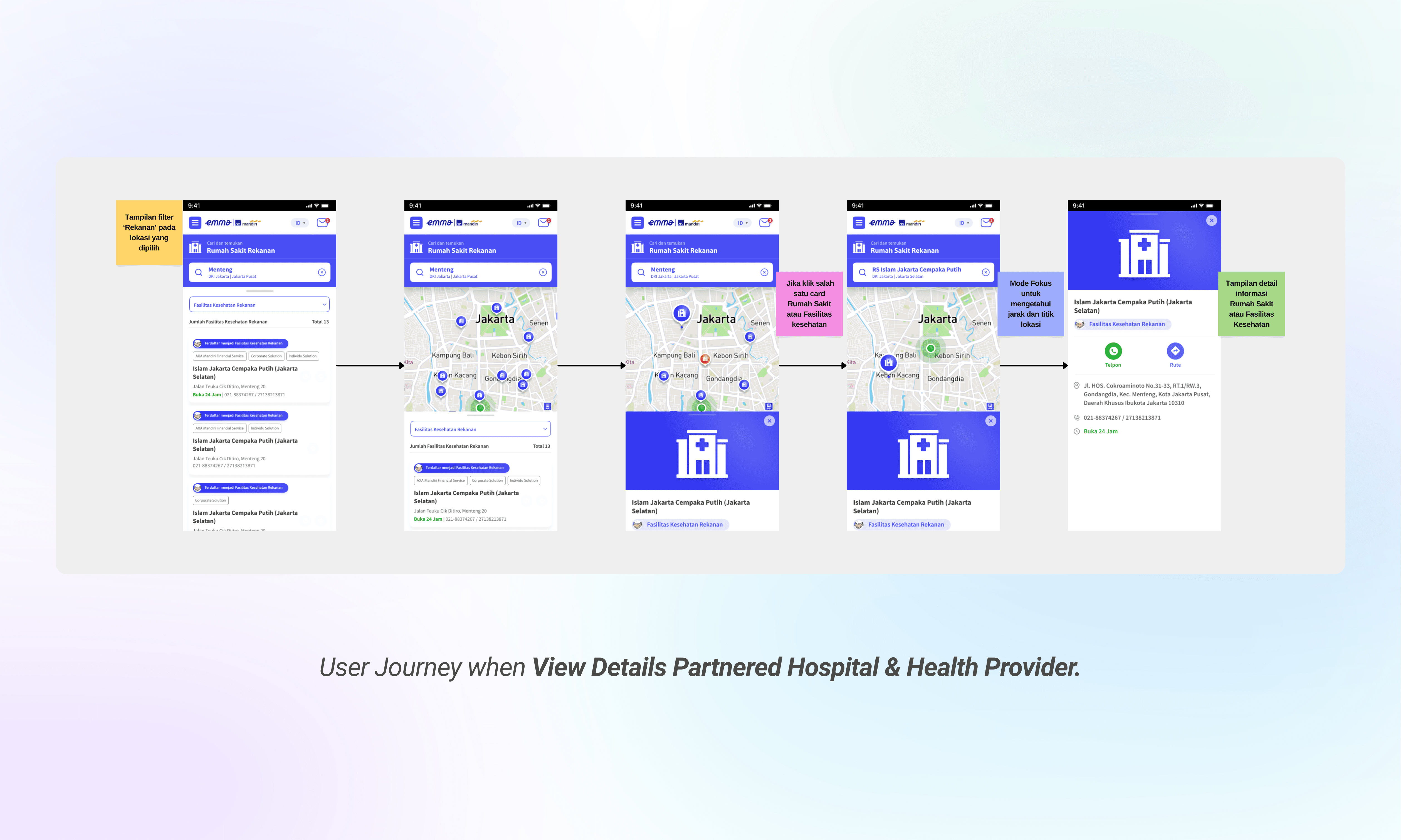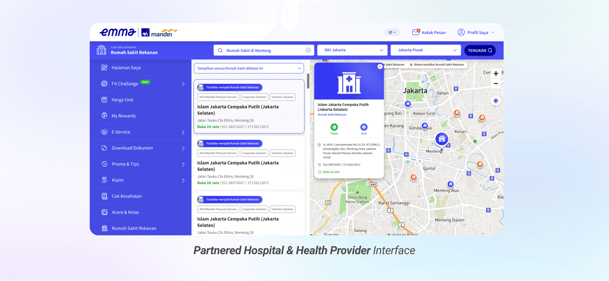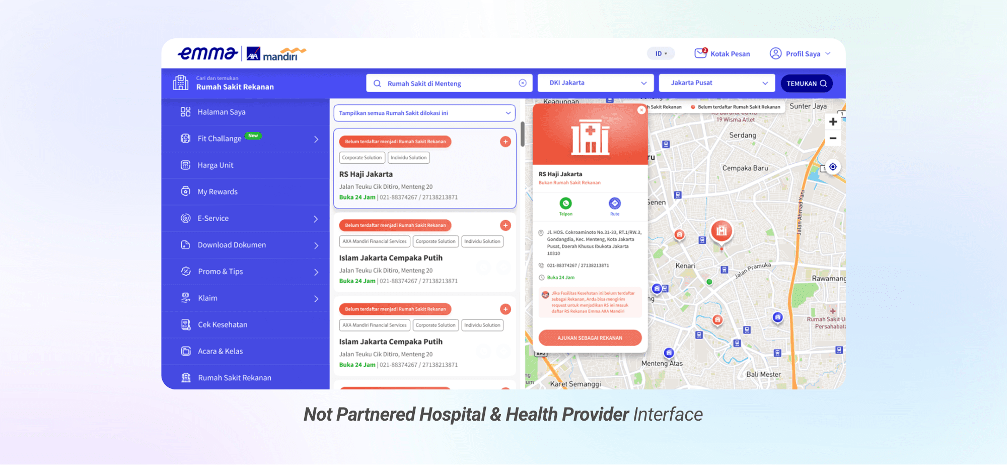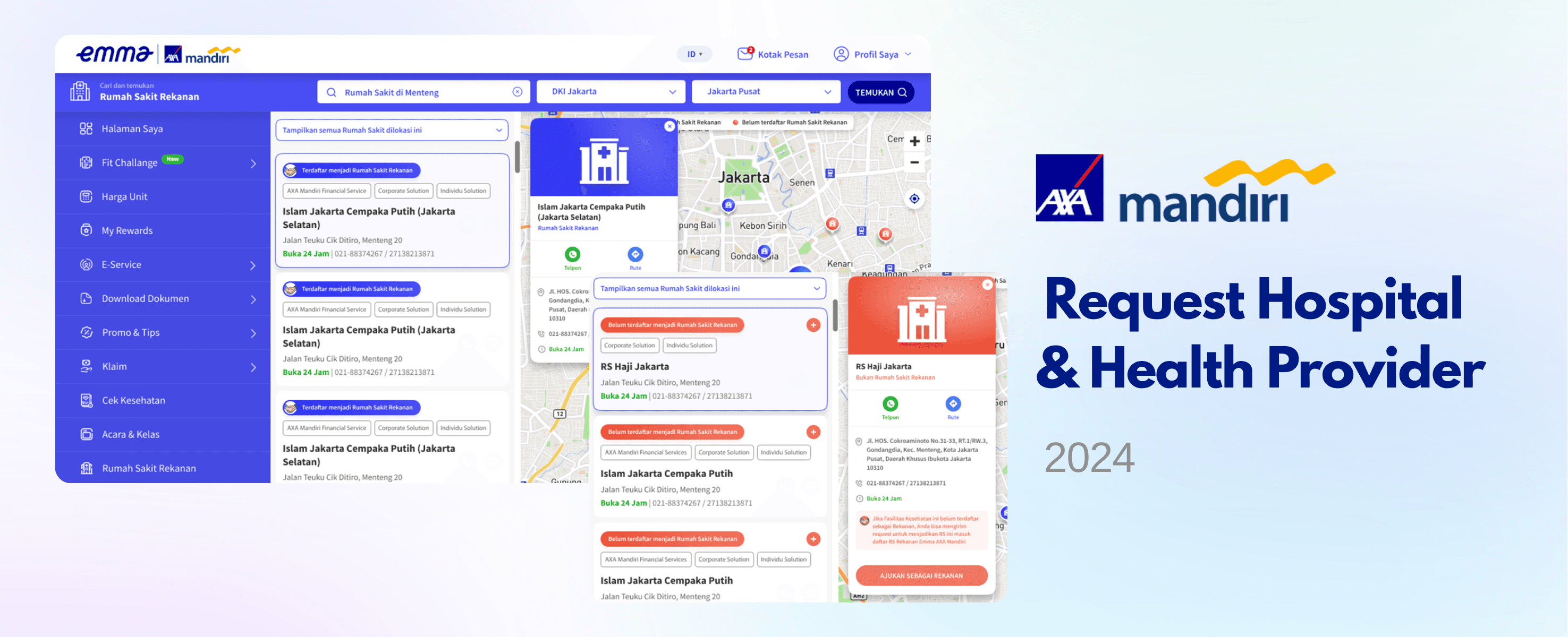 Feature Development: Collaborated with the UI/UX and development teams to enhance the "Partnered Hospital" menu on the Emma AXA Mandiri platform, such as location maps, filters based on partnership category, plan benefits for partnered hospitals and health providers, and a request button for non-partnered hospitals and health providers.