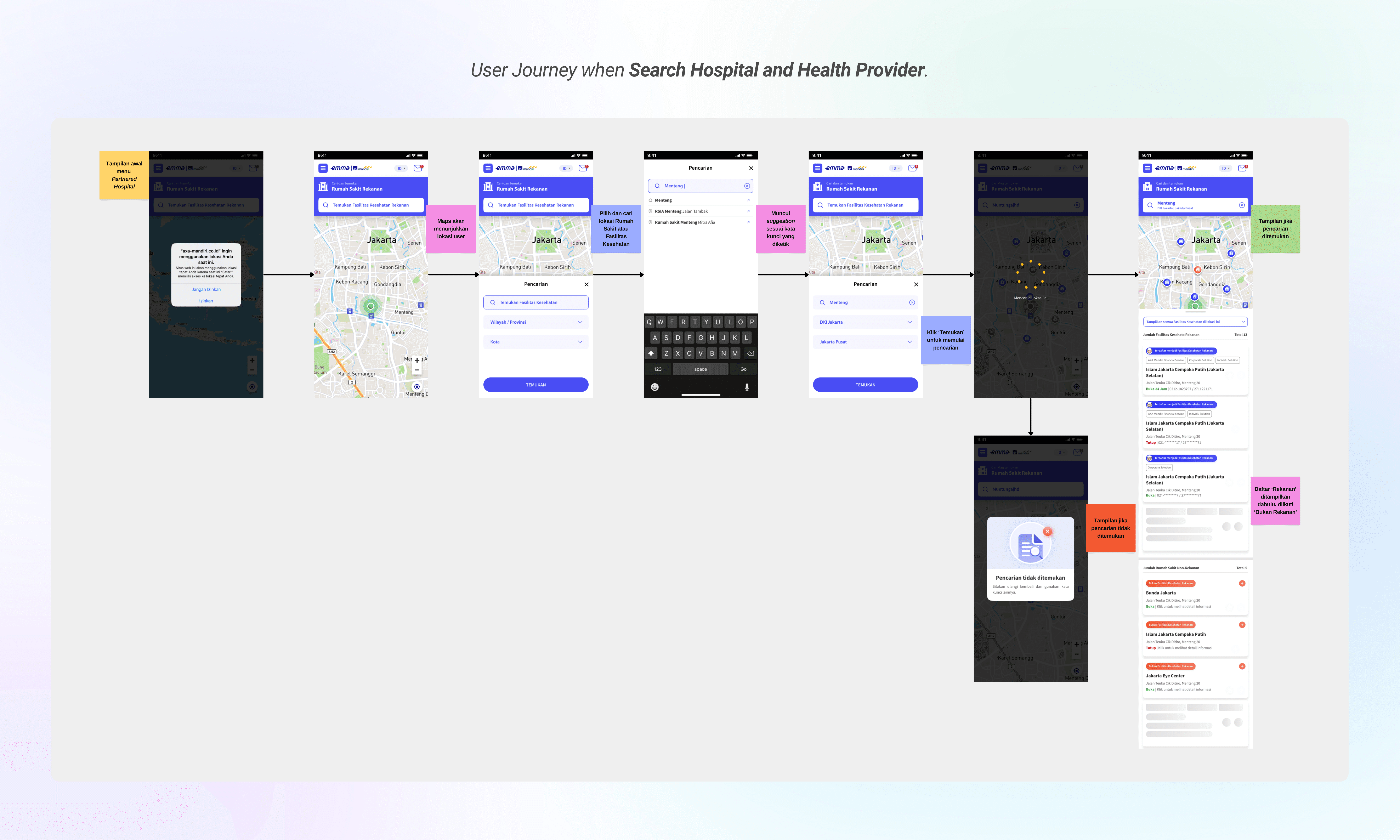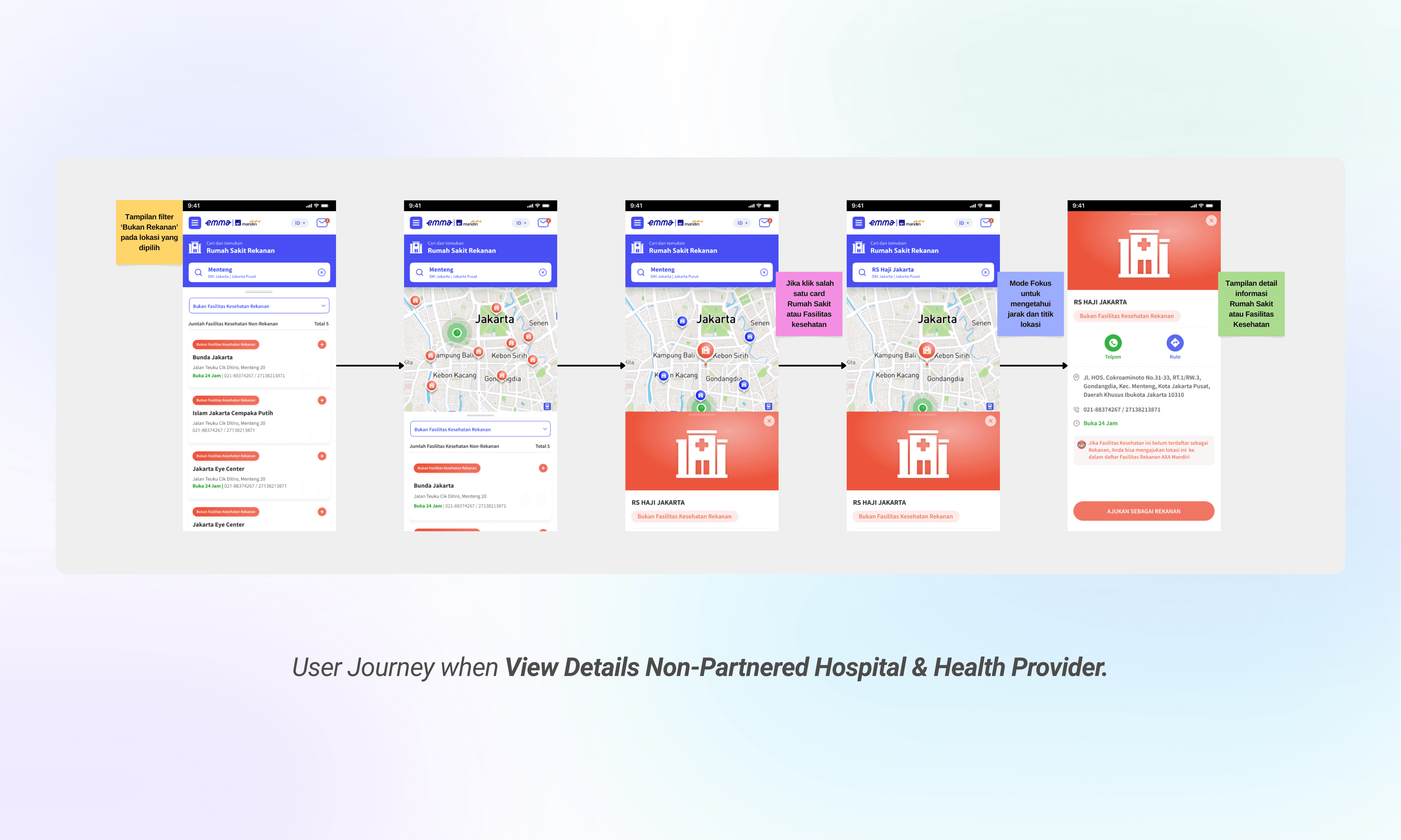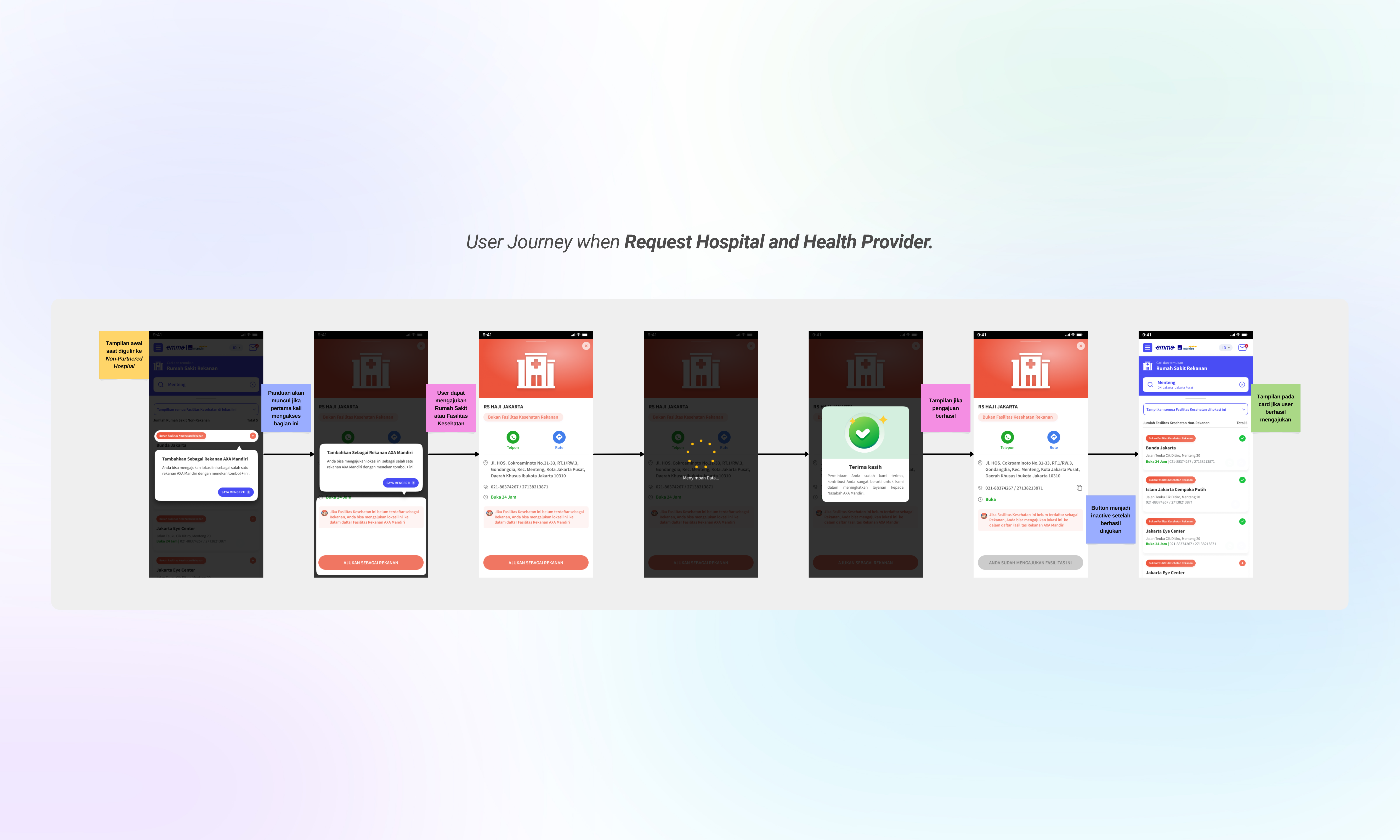 Users can search for hospitals and health providers that are already partnered with AXA Mandiri. If a provider is partnered, the insurance and protection plan benefits will be displayed. If not, users can easily submit a partnership request with a single action.